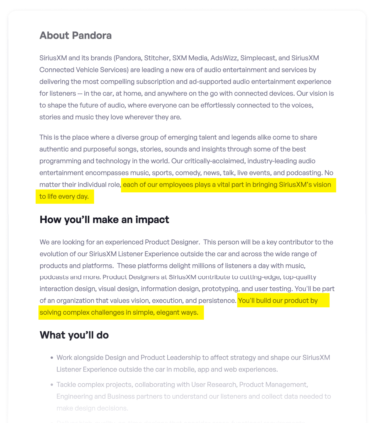 Reviewing the Pandora job description you’ll see it’s separated into different sections: About Pandora, How you’ll make an impact, What you’ll do, What you’ll need