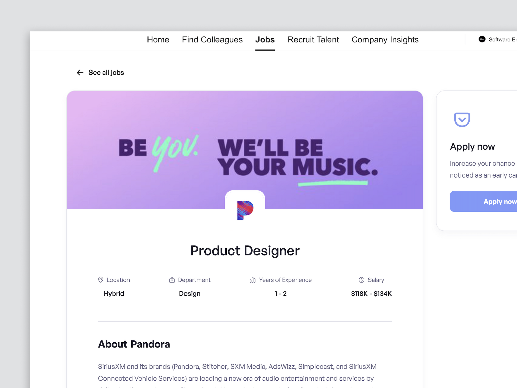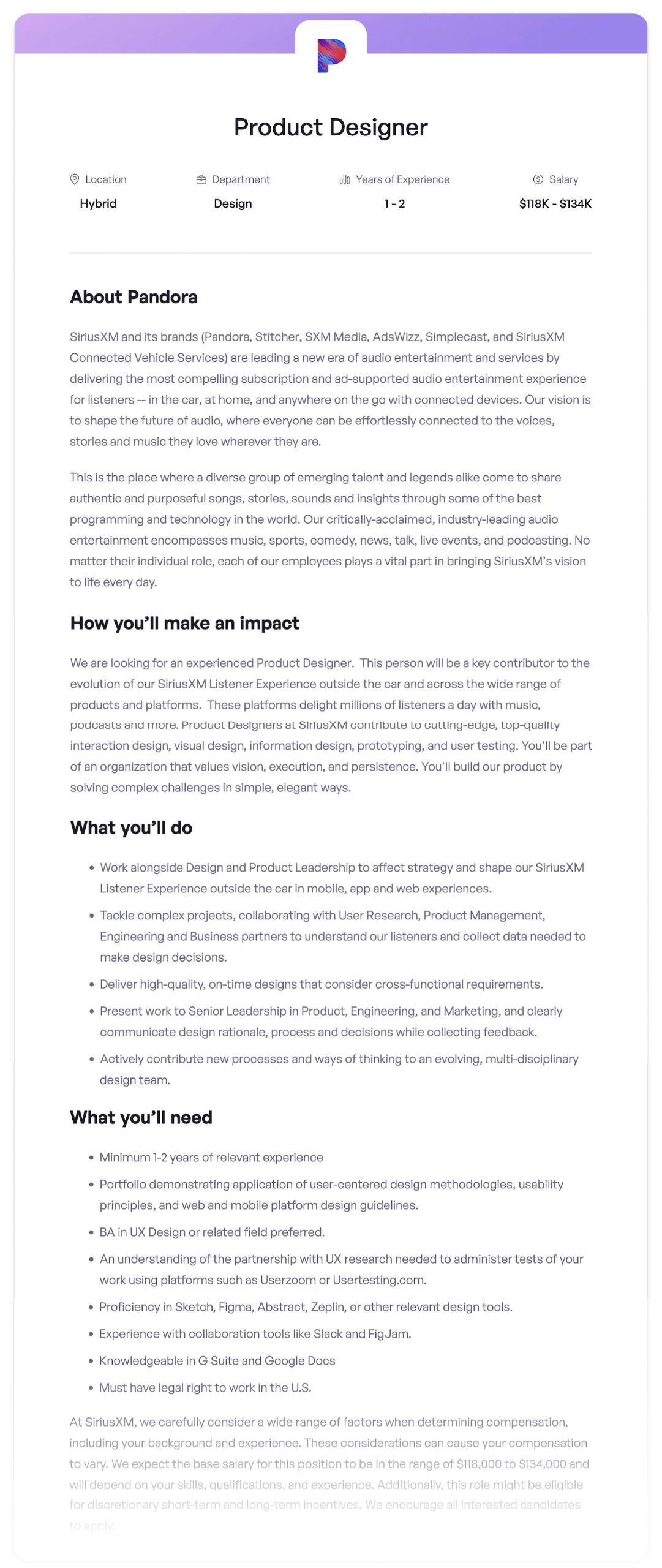 We’ll use this Product Designer position at Pandora as an example in how to create questions from a job description.